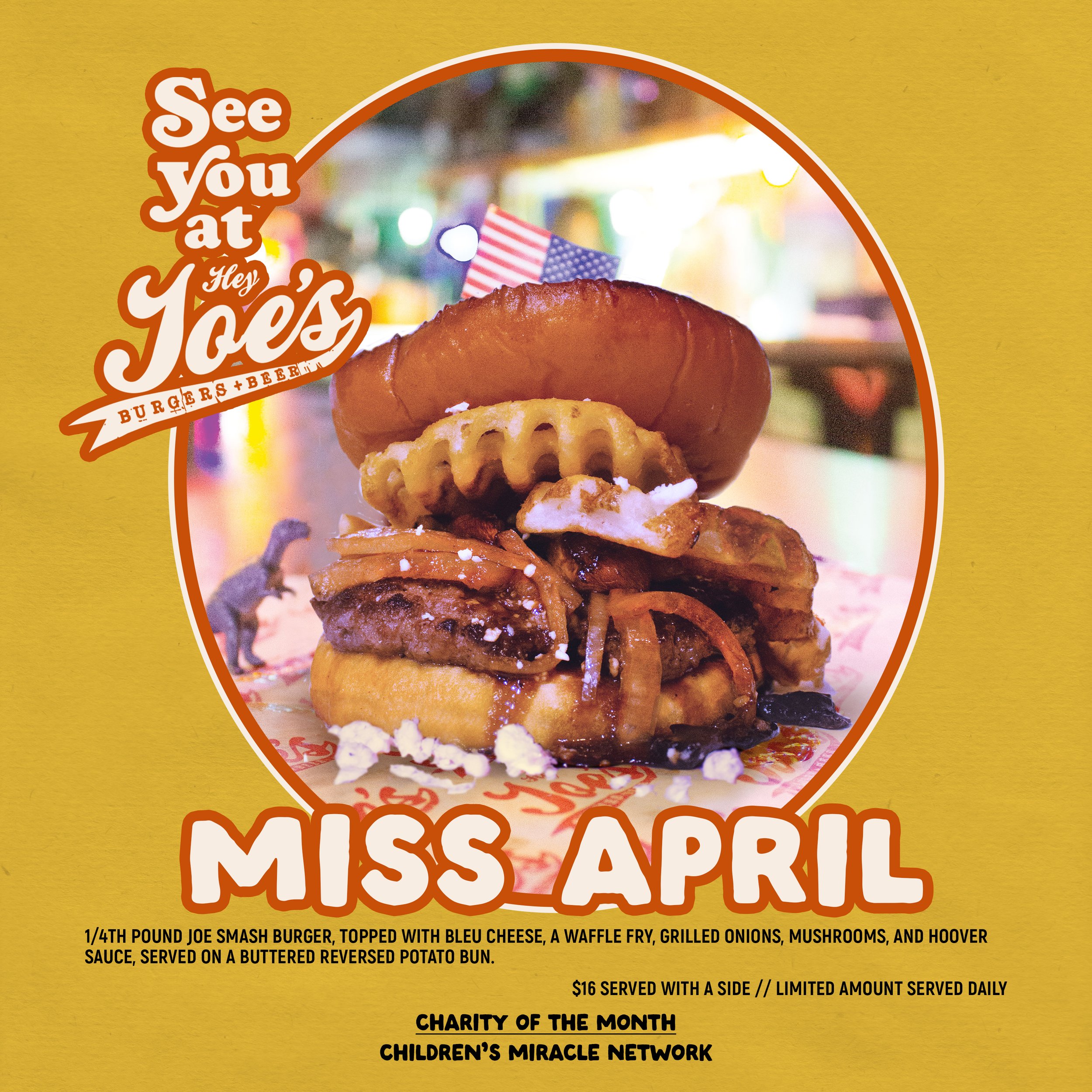 For every Burger of the Month special ordered, Hey Joe’s will donate $1 to a predetermined Charity of the Month. That’s 12 different charities every year that you can help us to help out just by ordering one of the greatest hamburgers you’ll ever eat. Giving while getting is a win win. Side included.