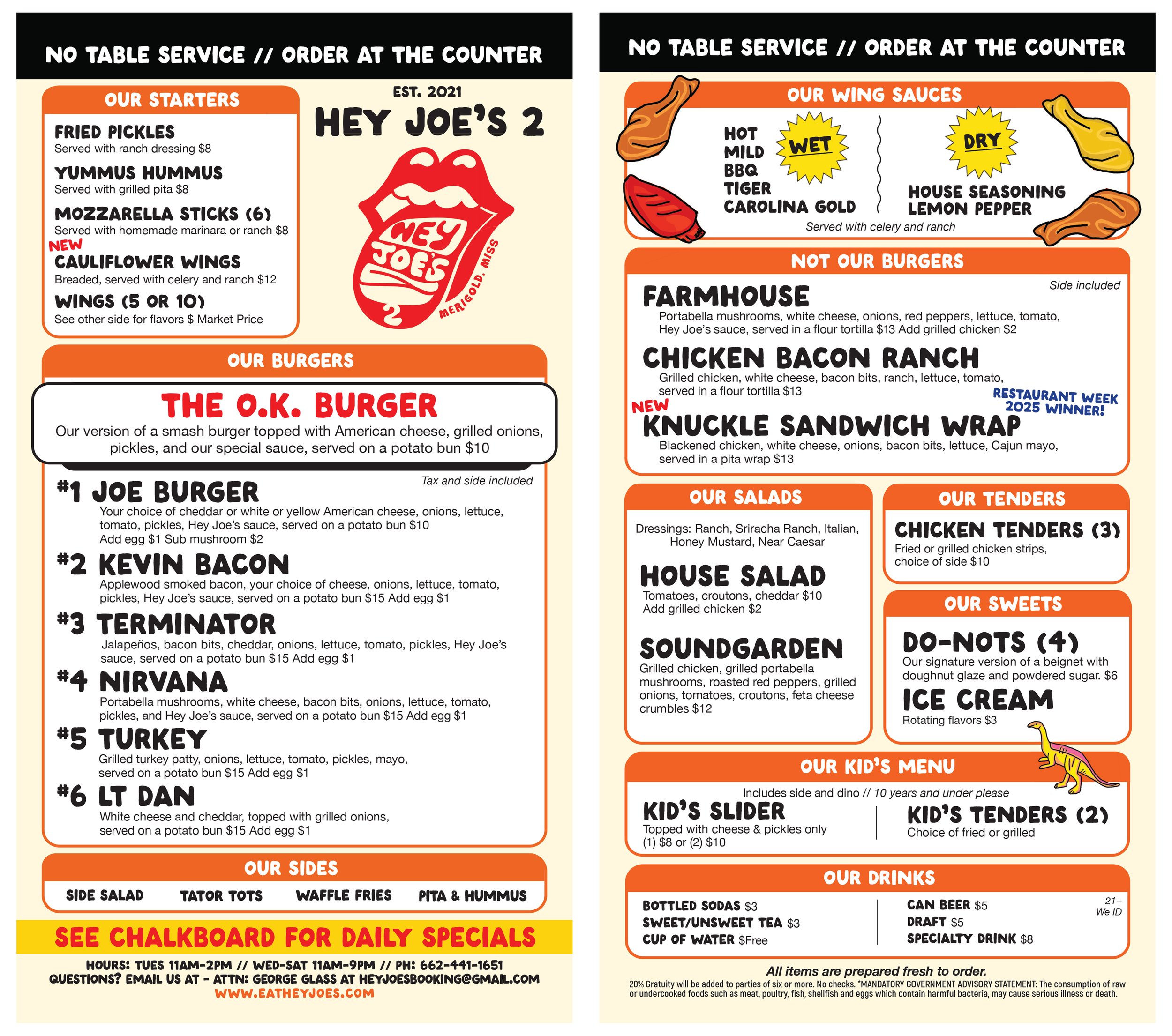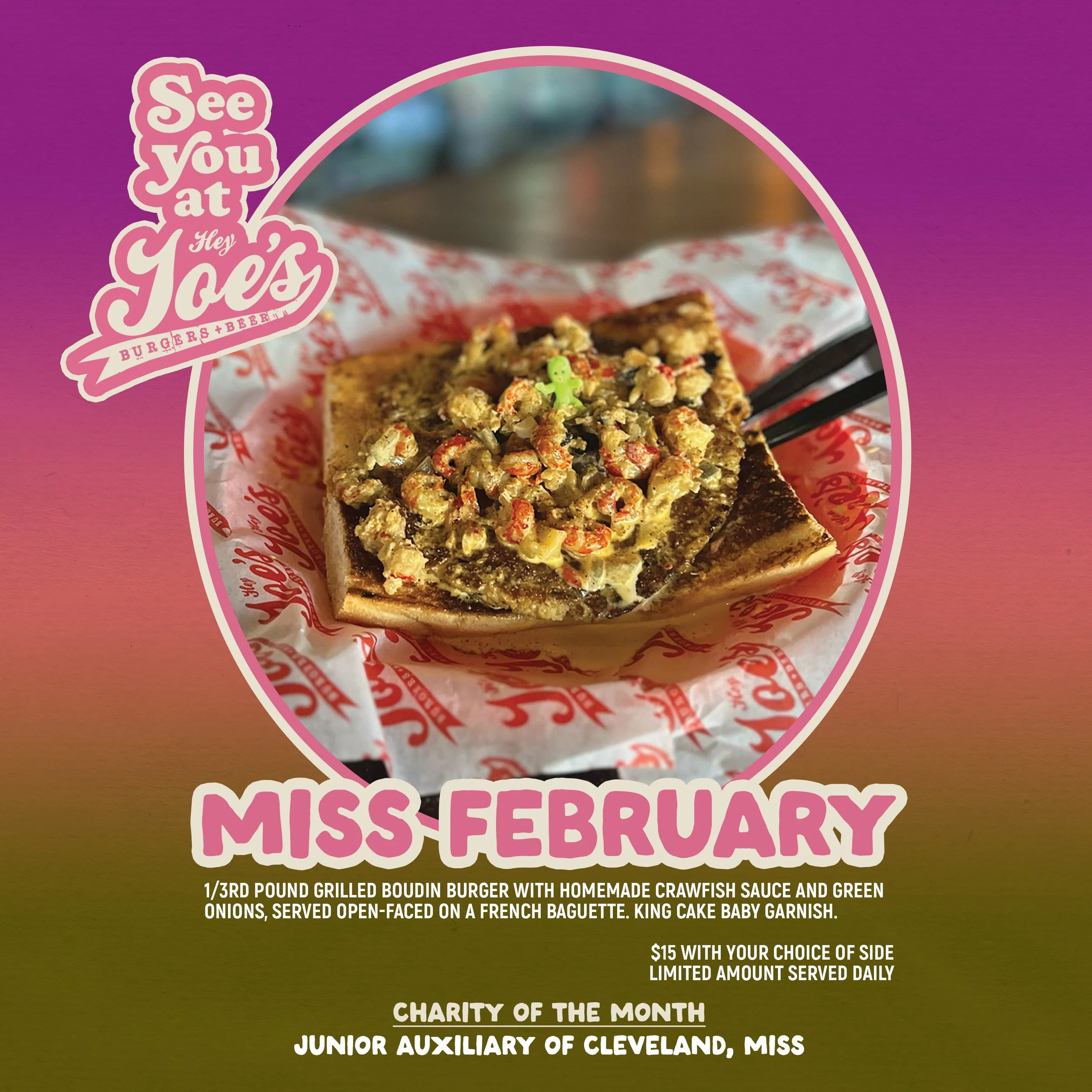 For every Burger of the Month special ordered, Hey Joe’s will donate $1 to a predetermined Charity of the Month. That’s 12 different charities every year that you can help us to help out just by ordering one of the greatest hamburgers you’ll ever eat. Giving while getting is a win win. Side included.